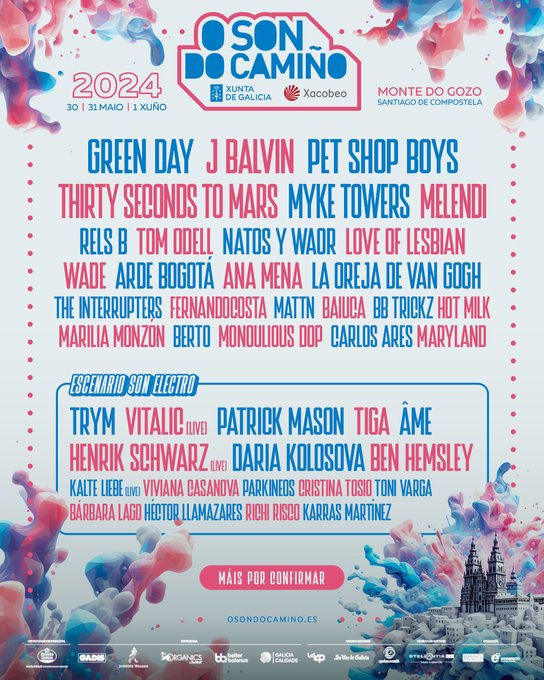 El festival gallego O Son Do Camiño 2024 ha anunciado este martes un gran avance del cartel -ya filtrado- para su presente edición. Jared Leto, líder de los confirmados Thirty Seconds to Mars, anunció por error el line up que debía anunciarse hoy en sus redes sociales y, aunque lo borró al poco tiempo, ya fue tarde: se había filtrado la participación de artistas y bandas como Green Day,Pet Shop Boys, J Balvin, Myke Towers, Melendi, Tom Odell, Wade, La Oreja de Van Gogh o Love of Lesbian.